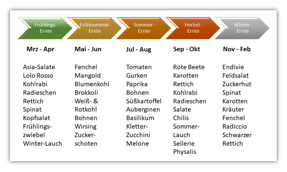 Als Inspiration soll Ihnen dabei nachfolgende Grafik dienen. Hier sehen Sie beispielhaft, in welchem Zeitraum das Gemüse geerntet werden kann – suchen Sie sich einfach Ihr Lieblingsgemüse aus und gehen Sie dann zur Detailplanung über.
