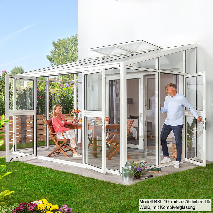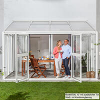 Die Verglasung erfolgt wahlweise mit hochwärmedämmenden, 16 mm starken, beidseitig UV-geschützten Stegdreifachplatten in "Longlife-Plus"-Qualität für das gesamte Anlehnhaus oder aber als Kombinationsverglasung: Senkrechte Scheiben in 4 mm starkem, transparentem Sicherheitsglas (ESG) - für uneingeschränkten Blick nach draußen -, Dachscheiben in 16 mm starken, beidseitig UV-geschützten Stegdreifachplatten in "Longlife-Plus"-Qualität.