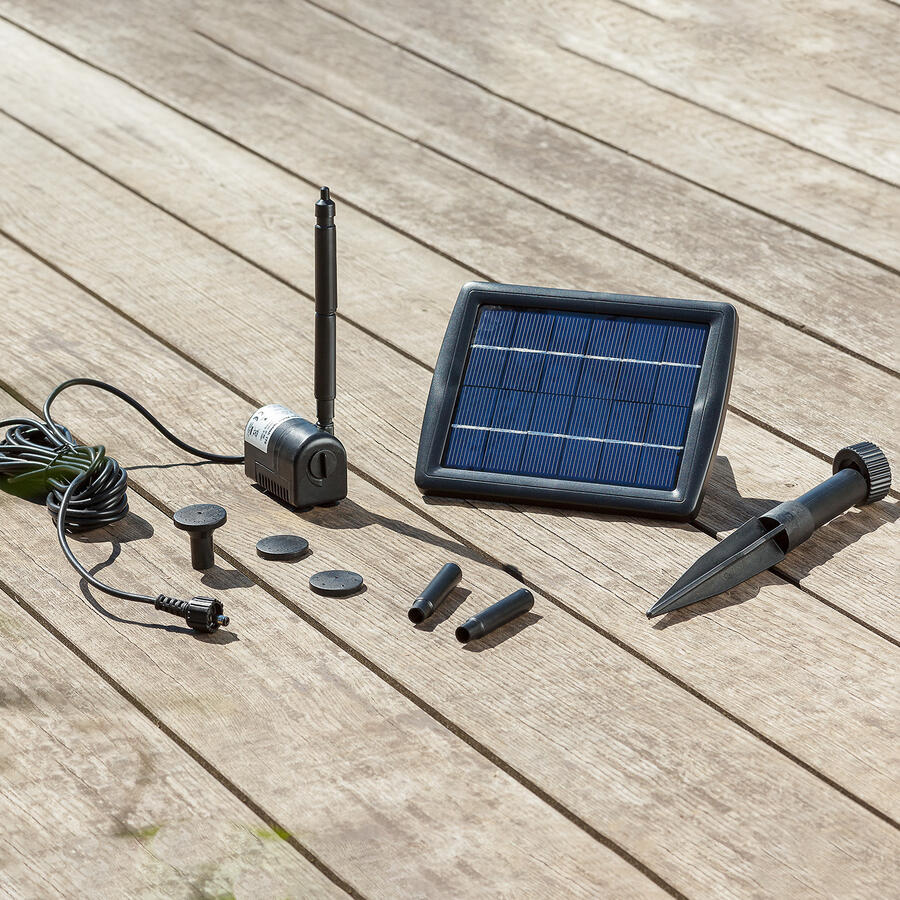Komplett-Set: 2 W-Solarmodul (Höhe 19 cm, Breite 13 cm), hochwertige Tauchpumpe, Fontänenhöhe max. 70 cm, Fördermenge max. 175 l/Std., 5 m Verbindungskabel, 4 Steigrohre und 4 verschiedene Düsenaufsätze.
