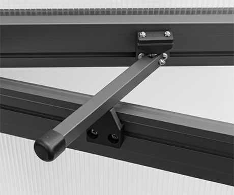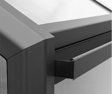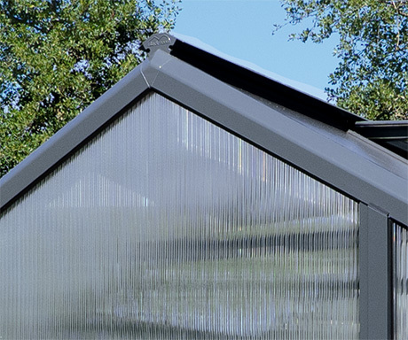 Die Verglasung besteht aus 10 mm starken, bruch- und hagelfesten Stegdoppelplatten aus Polycarbonat mit beidseitigem UV-Schutz.