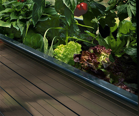 Das integrierte Hochbeet ist aus 20 mm starken Aluplanken gefertigt. Die Breite des 60 cm hohen Hochbeetes kann in 6 cm-Schritten zwischen 43 bis 79 cm eingestellt werden.