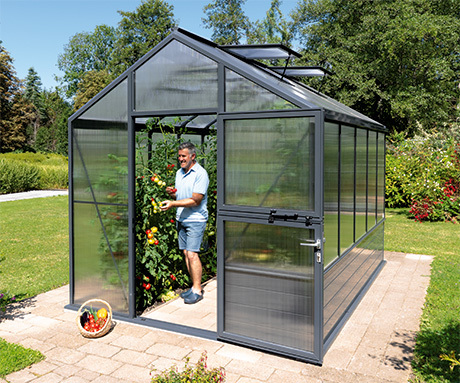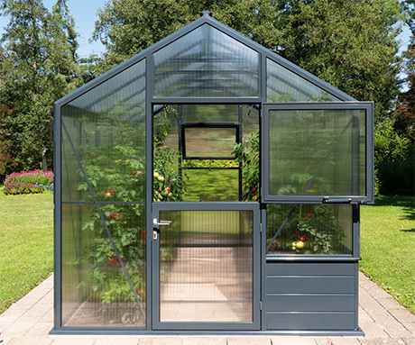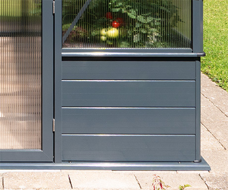 Das Gewächshaus Solanum® Modell VARIUS wird serienmäßig in zeitgemäßem Anthrazit (RAL 7016) geliefert, alternativ in jeder anderen RAL-Farbe (außer Perlfarben).