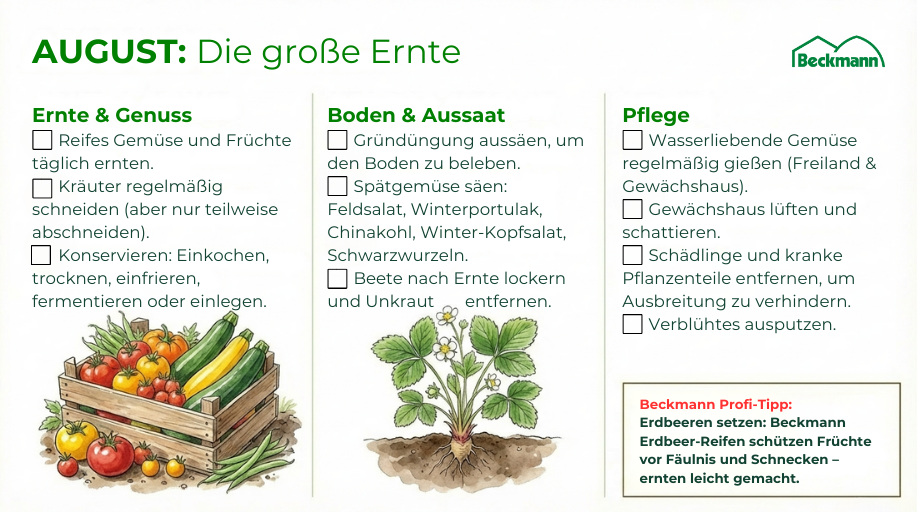 Im August ist Erntezeit im Gewächshaus und im Freiland. Tomaten, Paprika, Zucchini, Bohnen und andere Gemüsearten sollten regelmäßig geerntet werden, damit sich neue Früchte bilden. Mediterrane Kräuter können jetzt ebenfalls geerntet und für Tee, Gewürze oder zum Trocknen vorbereitet werden. Belüftung, ausreichendes Gießen und Schattierung sorgen weiterhin für ein optimales Gewächshausklima.