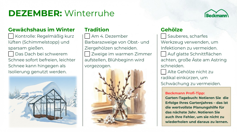 Traditionell werden am 4. Dezember Barbarazweige geschnitten, um erste Blüten ins Haus zu holen. Denken Sie zudem an den Kalkanstrich Ihrer Obstbäume und die regelmäßige Kontrolle Ihres eingelagerten Wintergemüses. Weitere wertvolle Tipps zur kalten Jahreszeit bietet unser umfassender Ratgeber für Dezember .