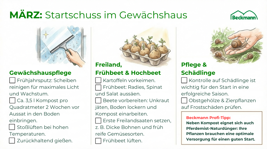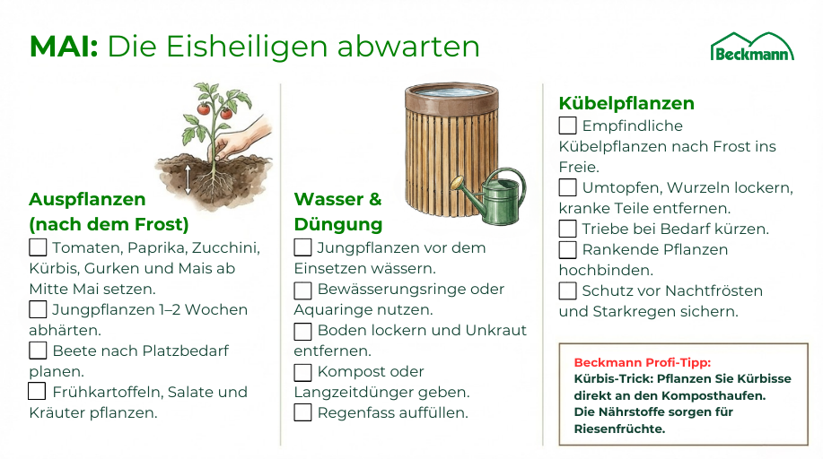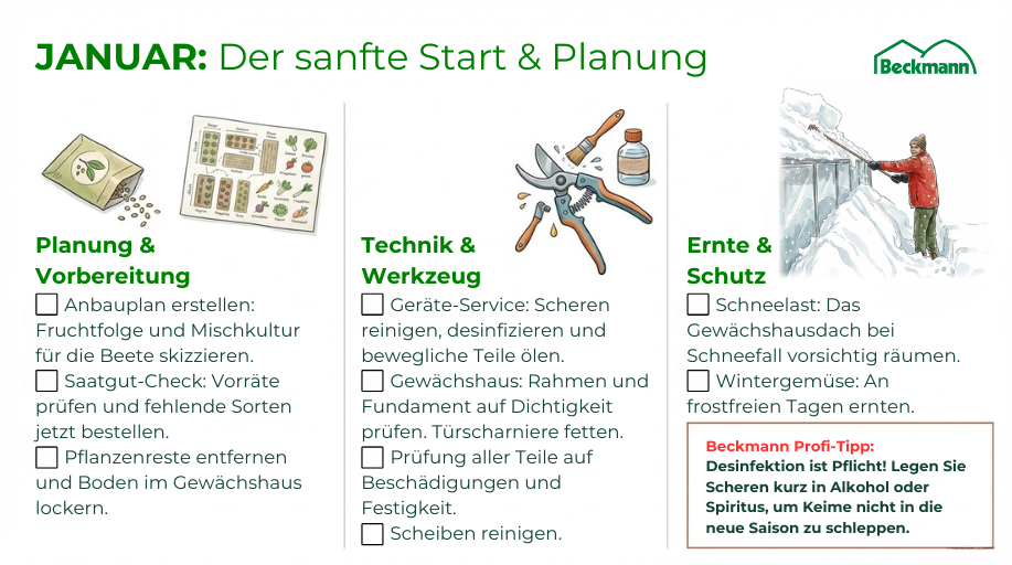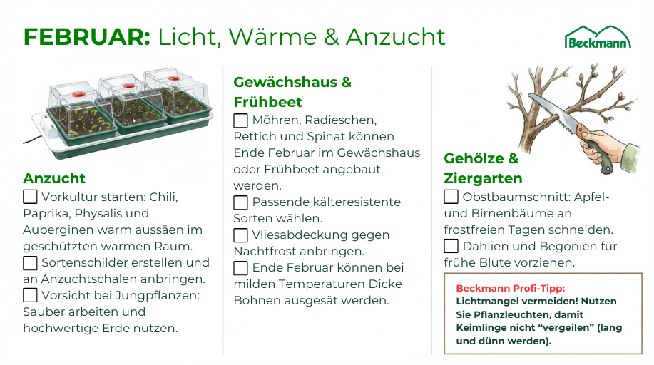 Mit dem Beckmann Gewächshaus- und Garten-Kalender begleiten wir Sie Monat für Monat durch alle wichtigen Arbeiten rund um Ihr Gewächshaus und Ihren Garten. Von der ersten Aussaat im Frühjahr über die intensive Pflege im Sommer bis hin zur Ernte und winterfesten Wartung – profitieren Sie von Praxiswissen und jahrelanger Erfahrung für ein gesundes Pflanzenwachstum.