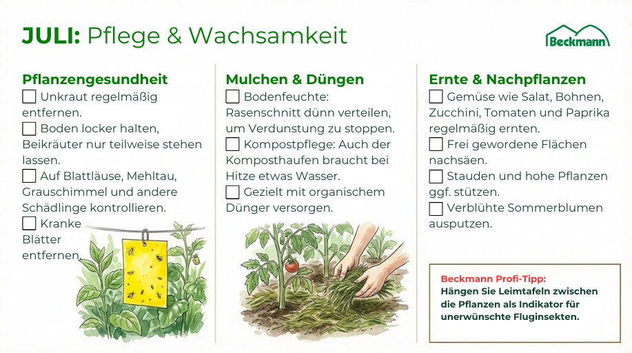 Der Juli ist die Hochsaison im Garten und im Gewächshaus. Tomaten, Gurken und Paprika hängen jetzt voll und sollten regelmäßig gegossen werden. Rankhilfen stützen die Pflanzen, und Unkraut muss konsequent entfernt werden, um Konkurrenz um Licht, Wasser und Nährstoffe zu vermeiden. Eine tägliche Kontrolle auf Schädlinge und Krankheiten verhindert Ausbreitung und Schäden.