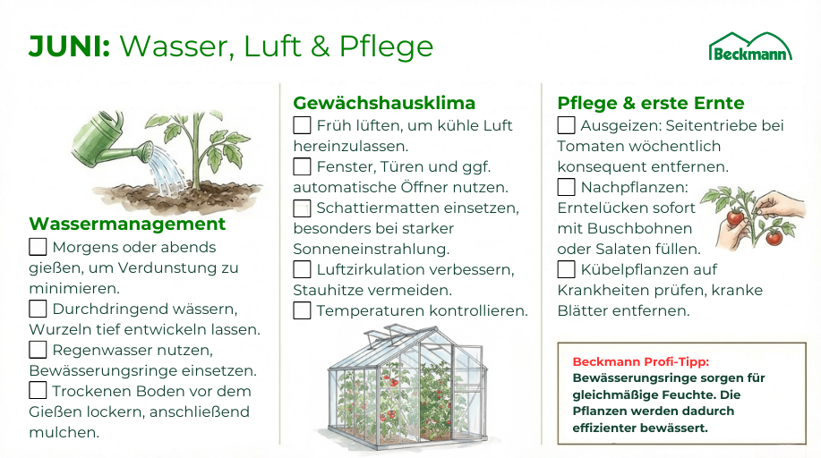 Im Juni benötigen die Kulturen im Gewächshaus besondere Aufmerksamkeit. Tomaten, Paprika und Gurken sollten gleichmäßig gegossen werden, Bewässerungsringe oder Aquaringe erleichtern die Wasserversorgung. Rankhilfen stützen hochwachsende Pflanzen, erste Ernten von Erbsen, Kohlrabi oder Salaten sind möglich. Kräuter wie Schnittlauch und Petersilie regelmäßig schneiden, um frisches Aroma zu sichern.