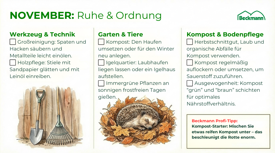Im Garten und für die Tierwelt stehen nun weitere wichtige Arbeiten an: Pflanzen wie Dahlienknollen werden eingelagert, immergrüne Gewächse regelmäßig gegossen, Gemüse geerntet und gesichert. Außerdem können wurzelnackte Sträucher oder Hecken gepflanzt und Igeln ein geschütztes Winterquartier angeboten werden, damit der Garten gut durch den Winter kommt.