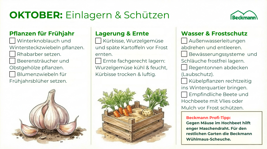 Der Oktober steht ganz im Zeichen von Pflege, Lagerung und Schutz vor der herannahenden Kälte. Es ist der ideale Zeitpunkt, um ein neues Hochbeet anzulegen oder ein bestehendes Hochbeet zu pflegen . Frühbeete und Gewächshäuser sollten von Pflanzenresten befreit, gereinigt und auf Sturmschäden überprüft werden. Die letzten Ernten im Gemüsegarten werden eingefahren, Wurzelgemüse, Kürbisse und Zwiebeln sachgerecht gelagert, und zusätzlich können Samen für das nächste Gartenjahr geerntet und aufbereitet werden.