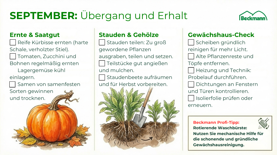 Der September ist ein klassischer Übergangsmonat im Garten- und Gewächshausjahr. Während viele Kulturen weiterhin zuverlässig Früchte tragen, beginnt parallel die Planung für die nächste Saison. Späte Tomaten, Bohnen, Kürbisse und andere Kulturen können jetzt noch regelmäßig geerntet werden. Gleichzeitig ist jetzt der richtige Zeitpunkt, Samen samenfester Sorten für das kommende Gartenjahr zu gewinnen. Auch das Teilen von Stauden sorgt im Herbst für vitale Pflanzen und bessere Blühfreude im nächsten Jahr.